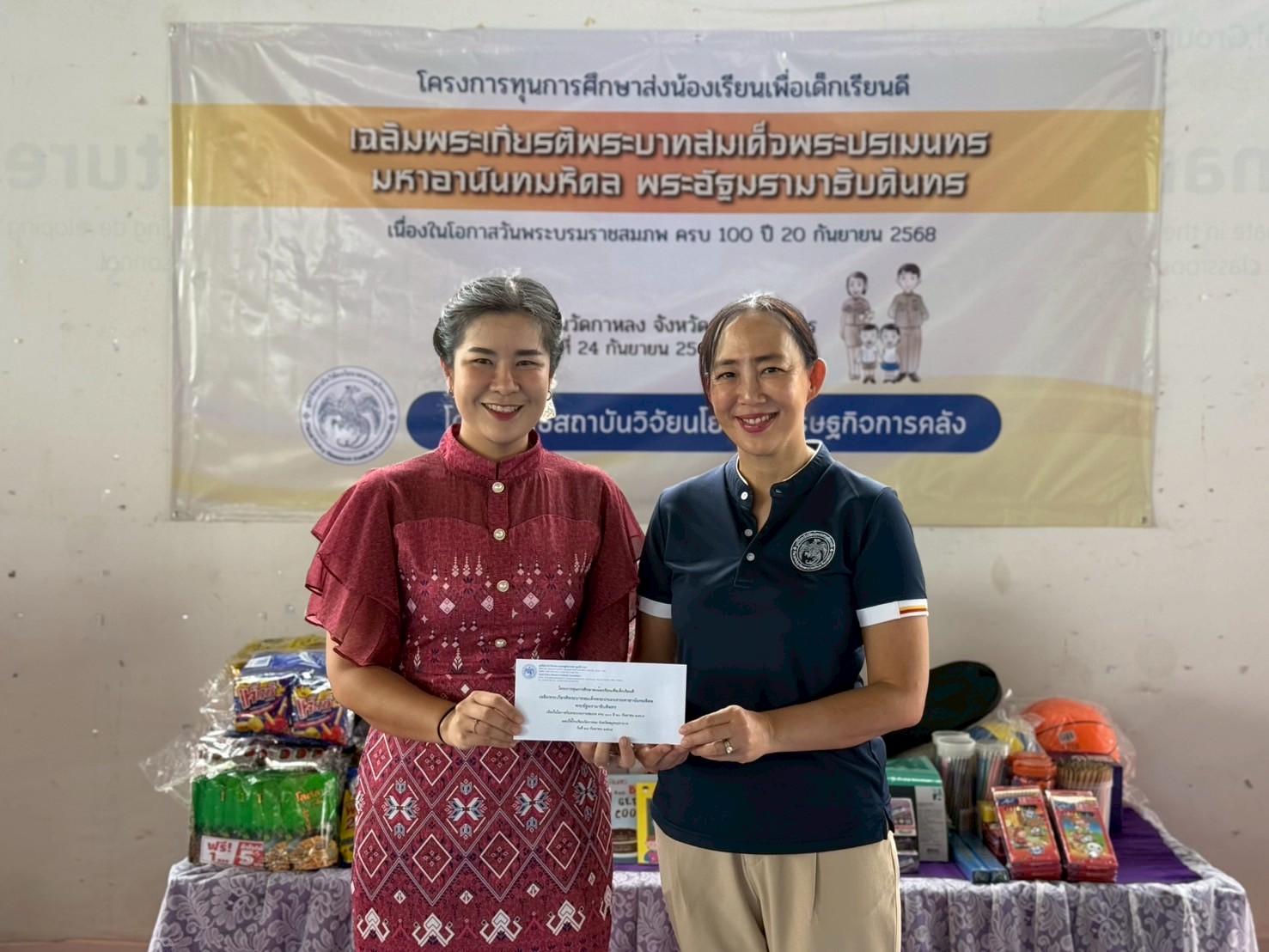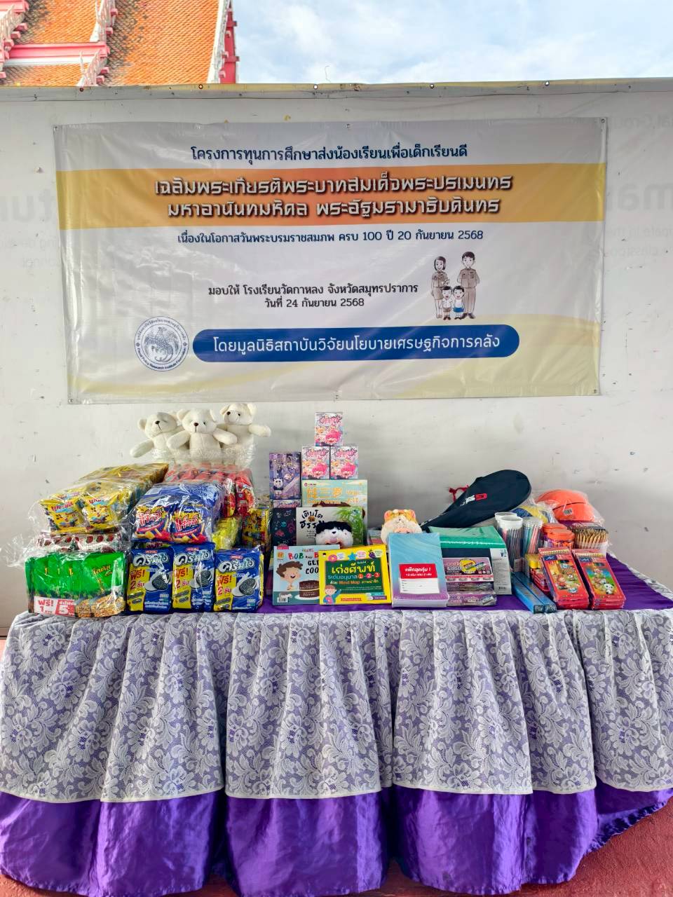 มูลนิธิสถาบันวิจัยนโยบายเศรษฐกิจการคลัง โดย ดร.จุฑาทอง จารุมิลินท ผู้อำนวยการสถาบันวิจัยนโยบายเศรษฐกิจการคลัง และพนักงาน จัดโครงการ “ทุนการศึกษาส่งน้องเรียนเพื่อเด็กเรียนดี เฉลิมพระเกียรติพระบาทสมเด็จพระปรเมนทรมหาอานันท มหิดล พระอัฐมรามาธิบดินทร เนื่องในโอกาสวันพระบรมราชสมภพครบ 100 ปี 20 กันยายน 2568”