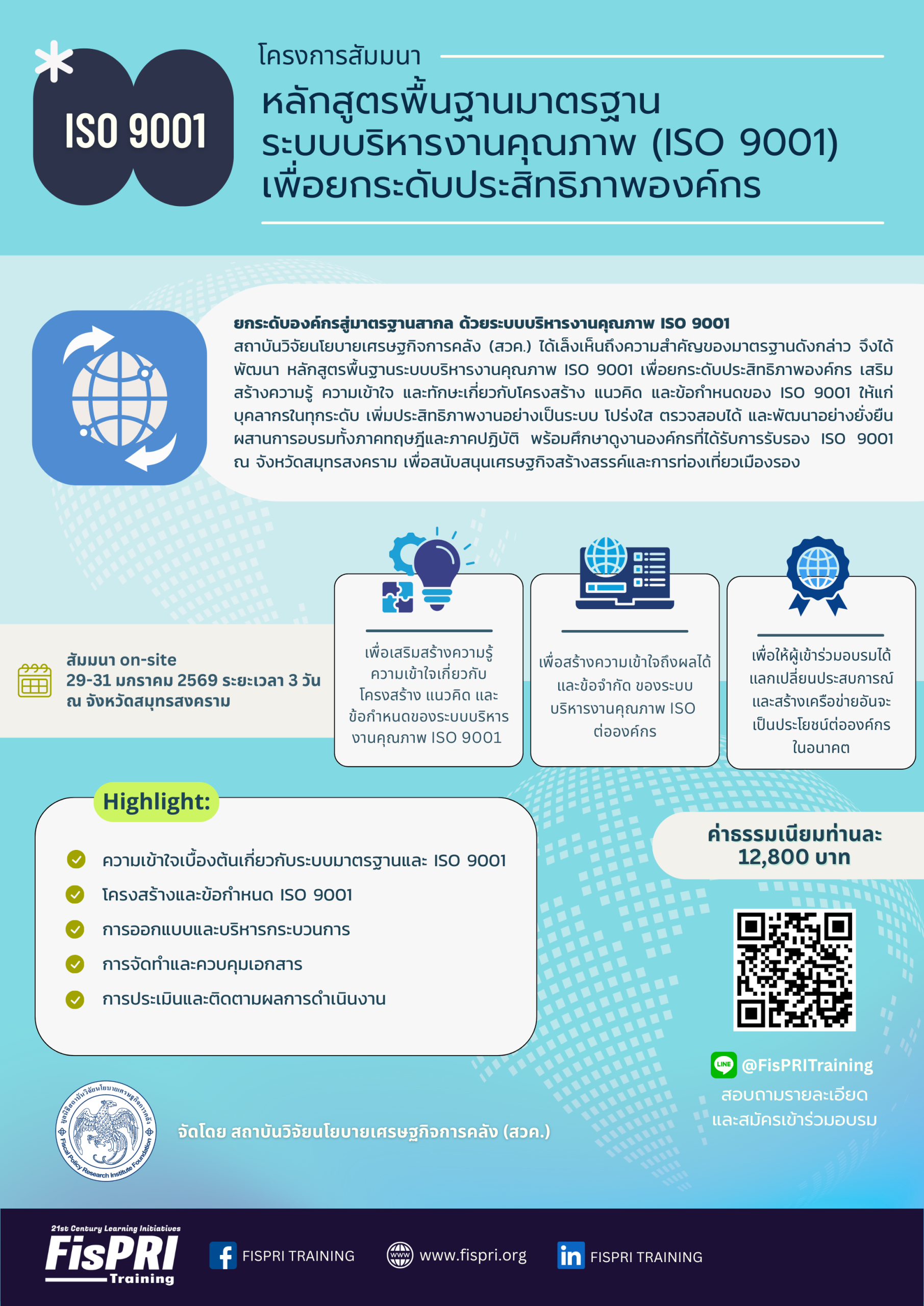 สถาบันวิจัยนโยบายเศรษฐกิจการคลัง (สวค.) เล็งเห็นถึงความสำคัญของมาตรฐานดังกล่าว จึงได้พัฒนา หลักสูตรพื้นฐานระบบบริหารงานคุณภาพ ISO 9001 เพื่อยกระดับประสิทธิภาพองค์กร เพื่อเสริมสร้างความรู้ ความเข้าใจ และทักษะเกี่ยวกับโครงสร้าง แนวคิด และข้อกำหนดของ ISO 9001 ให้แก่บุคลากรในทุกระดับ เพื่อให้องค์กรสามารถนำมาตรฐานไปใช้ได้อย่างเหมาะสมและเกิดผลลัพธ์ที่เป็นรูปธรรม โดยหลักสูตรนี้ผสานทั้ง การอบรมเชิงทฤษฎีและเชิงปฏิบัติ รวมถึง การศึกษาดูงาน ณ โรงงานหรือสถานประกอบการที่ได้รับการรับรอง ISO 9001 เพื่อให้ผู้เข้าอบรมได้เห็นตัวอย่างการนำระบบไปใช้จริง ตั้งแต่การจัดการกระบวนการ การควบคุมเอกสาร ไปจนถึงการติดตามและประเมินผลการดำเนินงาน พร้อมทั้งเรียนรู้แนวปฏิบัติที่ดีซึ่งสามารถนำไปปรับใช้ในองค์กรได้โดยตรง ทั้งนี้ ได้กำหนดให้มีการอบรมและศึกษาดูงาน ณ จังหวัดสมุทรสงคราม เพื่อสอดคล้องกับนโยบายของภาครัฐในการส่งเสริมการท่องเที่ยวจังหวัดรองและเศรษฐกิจสร้างสรรค์ (Creative Economy) ที่มุ่งกระจายรายได้สู่ท้องถิ่น และสนับสนุนการพัฒนาพื้นที่บนฐานทุนวัฒนธรรมอย่างยั่งยืนควบคู่กับการพัฒนาศักยภาพบุคลากรอีกด้วย